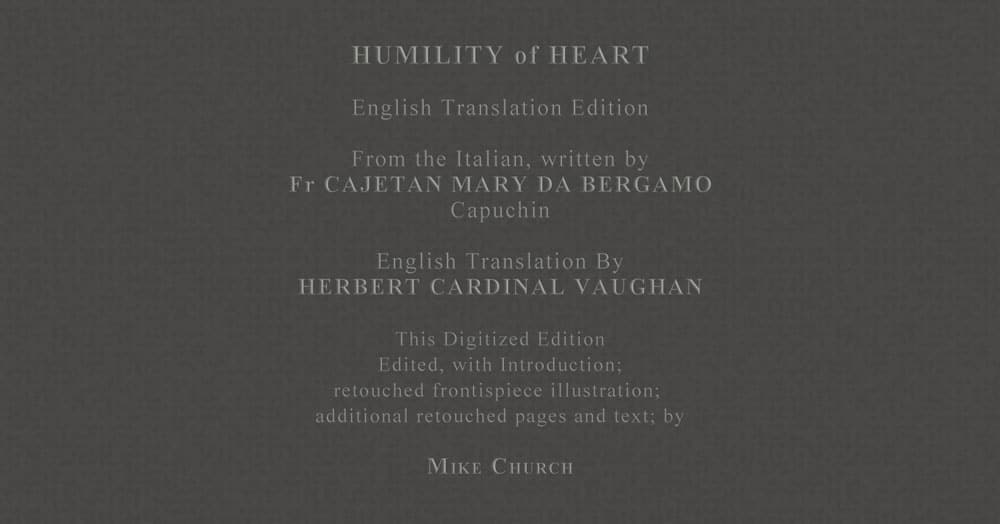 Thus begins the most revered book ever published on the subject of Humility, Humility of Heart, written in Italian in 1739 by Capuchin Friar Fr. Gaetano Maria de Bergamo and partially translated into English in 1905 by Herbert Cardinal Vaughan. Now author, filmmaker and radio host Frederick Michael Augutsine Mary Church (Mike Church) has performed the signal task of tackling the untranslated 59 pages, and restoring them to this work for English readers for the first time ever.
