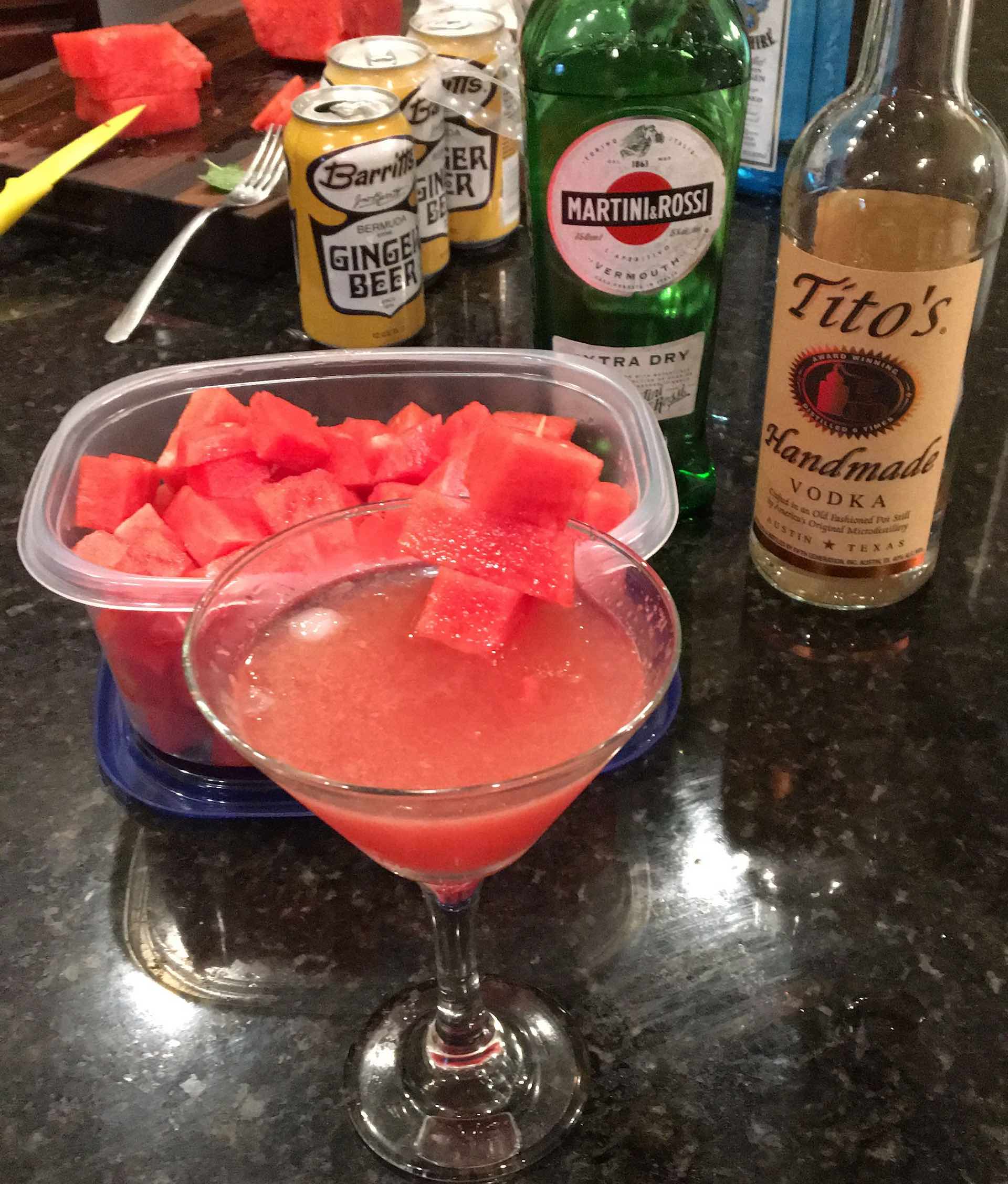 10-12 1 inch squares of a Sugar Watermelon, pulverized in a food processor (reserve 3 3cubes for garnish)
