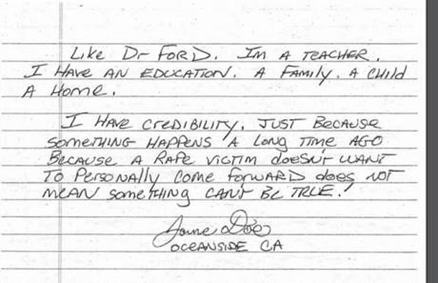 Note the address is in California and the postmark gives us another huge clue, the letter was mailed on 29 September the day after Michael Avenatti released his Julie Swetnick fraud. Why is this a clue? Because the allegation contains rape as an accusation not “sexual misconduct”, something that Demoncrats would ultimately not be able to use against Kavanaugh because this Jane Doe woman was found by the FBI, investigated and admitted that she fabricated this entire story.